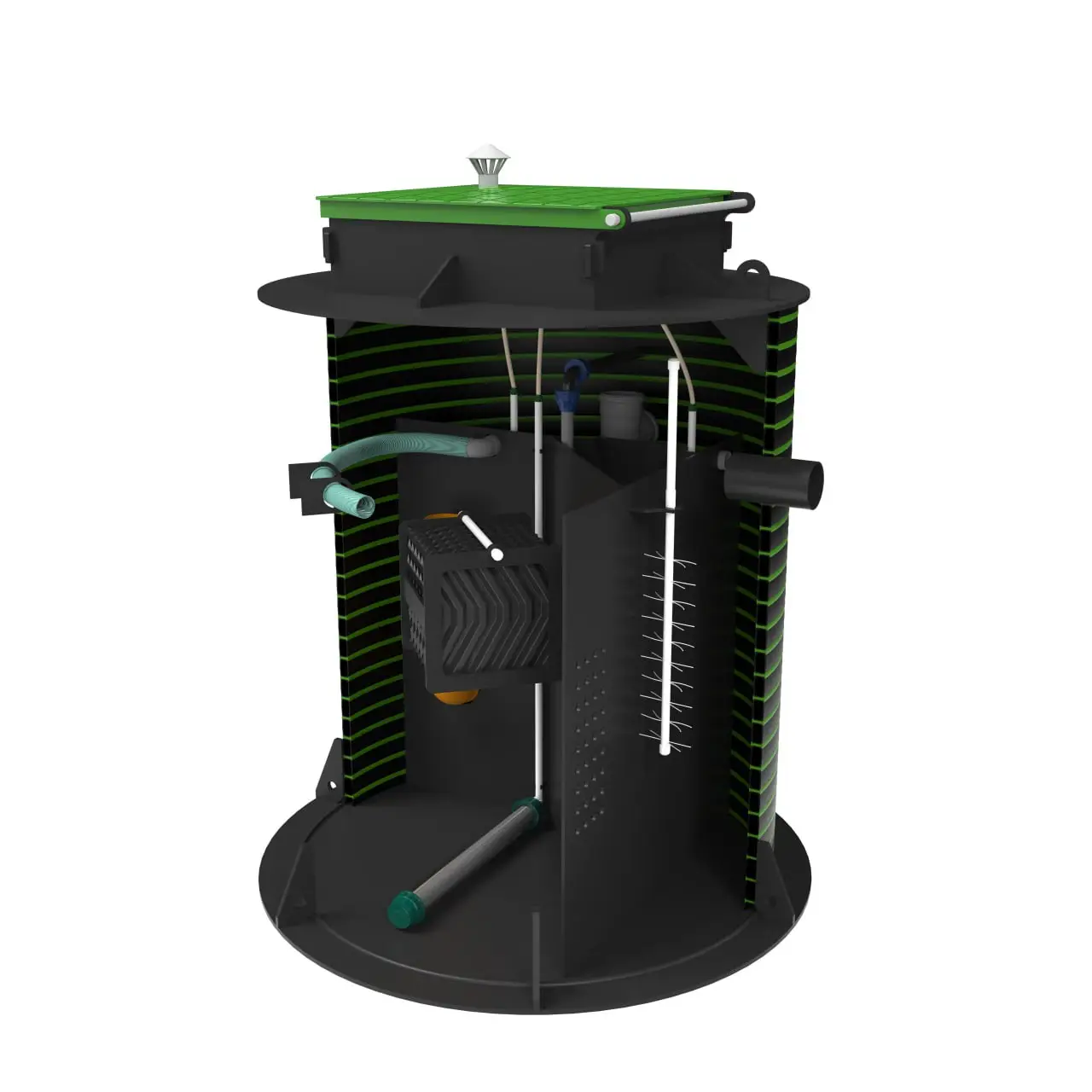 Конструктивно станция представляет собой многокамерную емкость из прочного, коррозионно-стойкого полиэтилена, соответствующую государственным стандартам. Внутри происходит последовательная очистка стоков, дополнительная обработка и стабилизация избыточного ила. Отвод очищенной воды может быть как самотечным, так и принудительным.