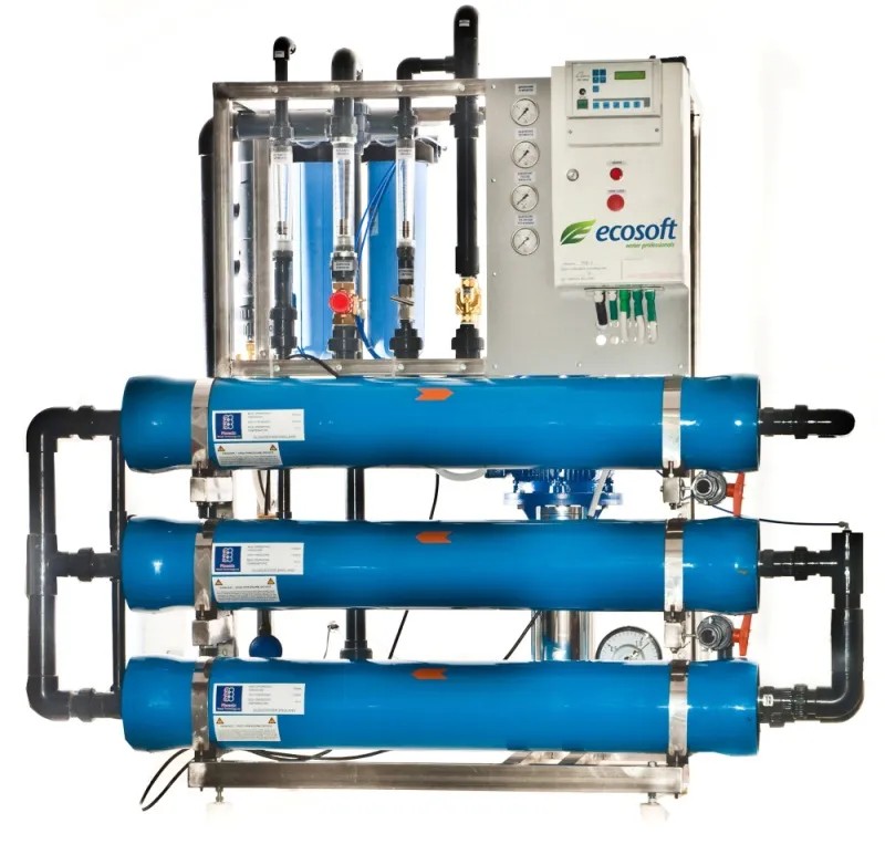 Обратный осмос ЭкоСофт МО Миди включает следующие основные компоненты: фильтр предочистки, мембраны, насос высокого давления, фитинги, трубопроводы, защитную автоматику.