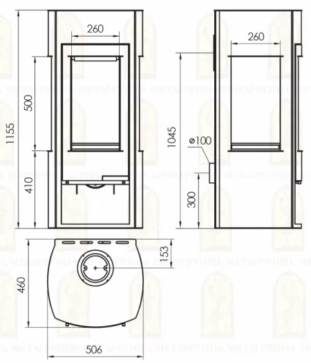 Пристенная высокая дизайнерская печь с панорамным обзором. Обзор огня с трех сторон. Оборудована большой остекленной дверкой выполненной в одной плоскости с корпусом печи и с двумя боковыми стеклами. Дверка высотой 600 мм и боковые стенки выполнены с небольшим радиальным изгибом. Ручка открывания утоплена внутрь дверки. Подсоединение к дымоходу сверху или сзади.
