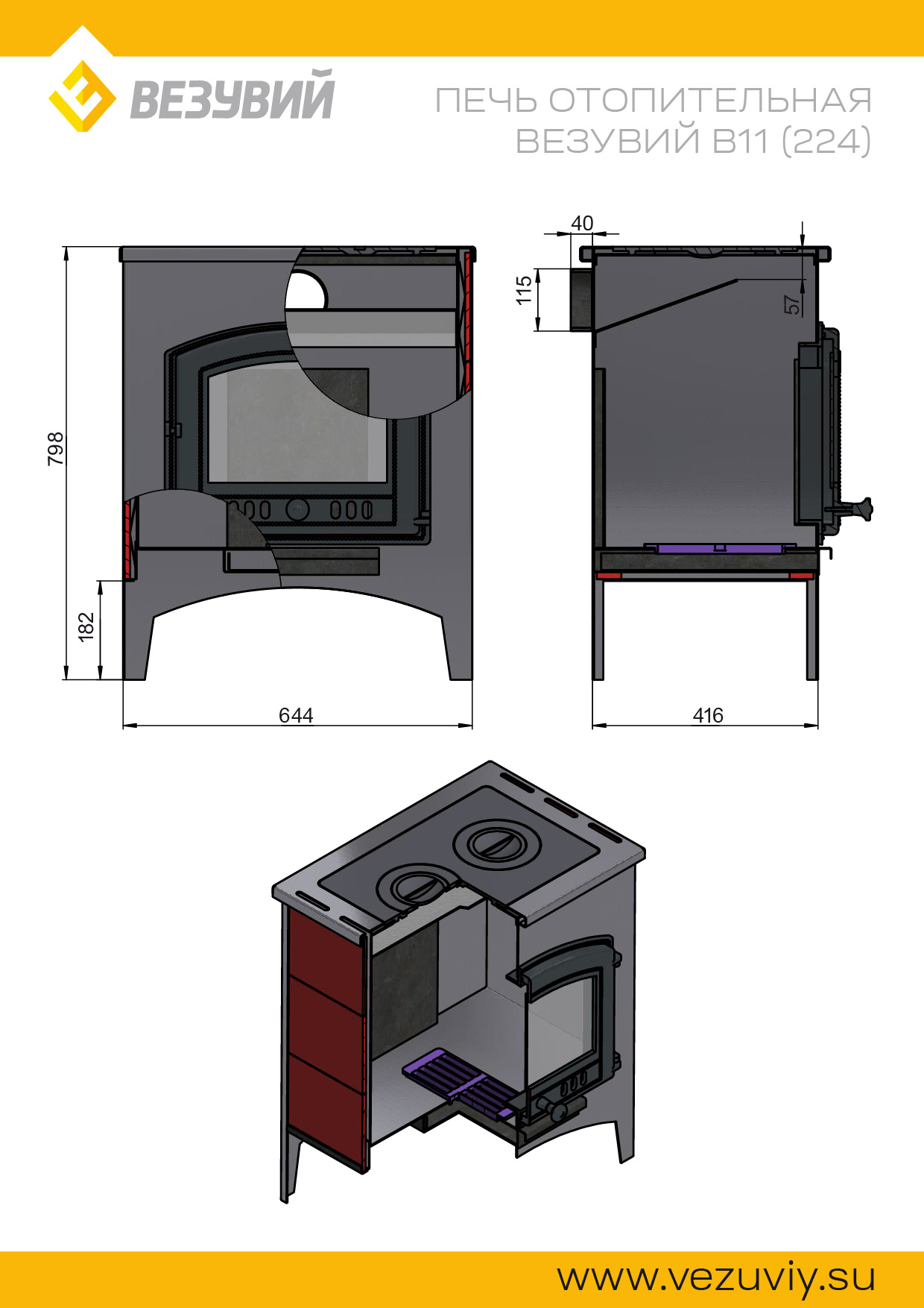 "Везувий" В11 отличается длительным горением – до 6 часов на одной закладке топлива, с возможностью легкой регулировки интенсивности пламени путем управления шибером дымовой трубы и зольником.